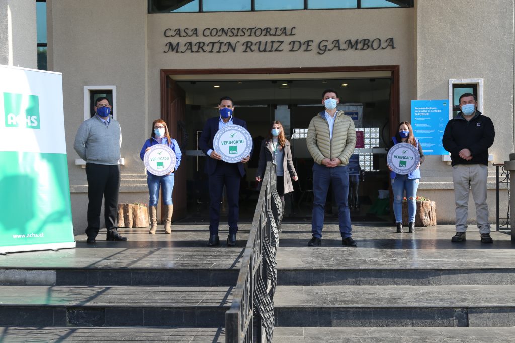 El Edificio Consistorial Martín Ruiz de Gamboa, el Departamento de Desarrollo Productivo y la OPD de la Municipalidad de Chillán Viejo recibieron el Sello Covid-19 que otorga la Asociación Chilena de Seguridad (ACHS), por el cumplimiento de los estándares y protocolos sanitarios para la prevención del contagio de Covid.